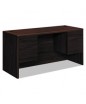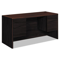 A modular management solution that combines stylish profiles and elegant accents with top-grade fit and finish. Laminate with rounded corners and waterfall edge. Full-extension file drawers and 3/4-extension box drawers ride on steel ball bearing suspensions. Hang rails accommodate letter and legal size hanging files. Two cord management grommets. HON® "One Key" core removable locks. Color: Mahogany; Pedestal Count: 2; Drawer Configuration: Left: Box/File; Right: Box/File.