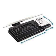Sit/stand-capable with the highest above-desk clearance in the industry (10) for correct ergonomic position and working comfort. Highly adjustable keyboard tray features lateral adjustment, 14 height range, 360 swivel and +10/-15 tilt. Easy height adjustment-just tilt platform, adjust, then release to lock in place; dial the tilt knob to set desired angle. Independent articulating mouse platform can be mounted right or left. Patented leatherette gel wrist rests with antimicrobial product protection. Precise™ mousing surface extends battery life. Color: Black; Workstation Type: 90 Corner; Curved; Diagonal; Straight.